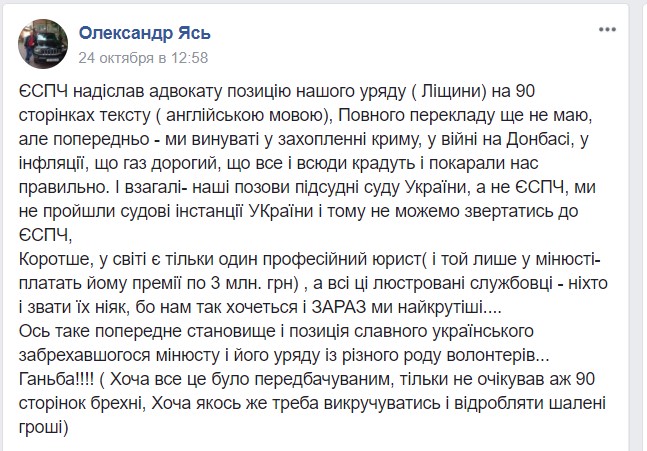 "Предварительно - мы виновны в захвате Крыма, войне на Донбассе, инфляции, удорожании газа, том, что все и всюду воруют, а наказали нас правильно. И вообще, наши иски подсудны суду Украины, а не ЕСПЧ, мы не прошли национальные судебные инстанции", - написал экс-прокурор.
