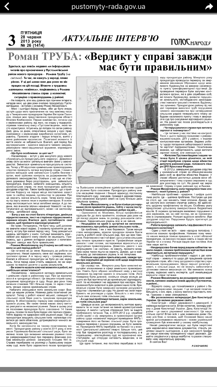 "У меня и сегодня перед глазами, будто бы это было вчера, встреча по поводу моего назначения на такую важную должность с генеральным прокурором Украины Виктором Пшонкой, дальнейшее мое представление прокурором (Львовской - Прим. Ред.) области Виталием Ковбасюком, - говорил Труба в интервью изданию "Голос народу" в июне 2013 года. - Первое знакомство, рукопожатия с руководителями района, от которых на память в подарок получил книгу "Пустомитівщина", которой часто пользуюсь, готовясь к поездкам по селам района".