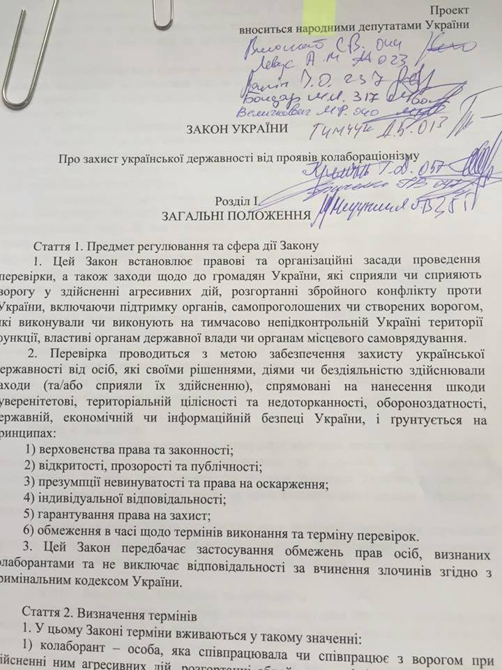 "Сейчас лица, причастные к коллаборационизма, продолжают занимать или претендовать на высокие должности в государстве, что является недопустимым. Кроме того, в ходе урегулирования конфликта многим таким лицам будет предоставлена ​​амнистия, к ним будет применено законодательство по недопущению преследования и наказания лиц - участников событий на временно оккупированной территории Украины. Нет сомнений, что коллаборационизм должен быть осужден, а определенные права коллаборационистов ограничены в целях защиты национальных интересов Украины, обеспечение мира, безопасности и демократического развития государства", - сказано в пояснительной записке к проекту Закона на сайте Верховной Рады.