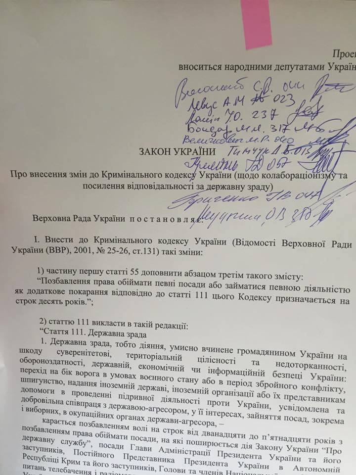 Этот документ зарегистрирован вместе с другим законопроектом "О внесении изменений в уголовный кодекс Украины (относительно коллаборационизма и усиления ответственности за государственную измену)".