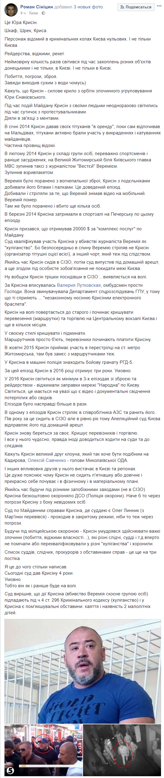 Ранее в журналистских расследованиях коллег Веремия из газеты "Вести" фигурировали сведения, что Крысин в 2015 году принимает активное участие в рейдерских захватах - в частности Лукьяновского рынка, а также собирал дань с автоперевозчиков около железнодорожного вокзала.