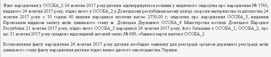 Еще пример – признание Красноармейским судом Донецкой области факта рождения ребенка в Донецке. Согласно решению суда, этот факт подтверждается свидетельством о рождении, которое выдал Кировский  отдел "Министерства юстиции Донецкой Народной Республики":