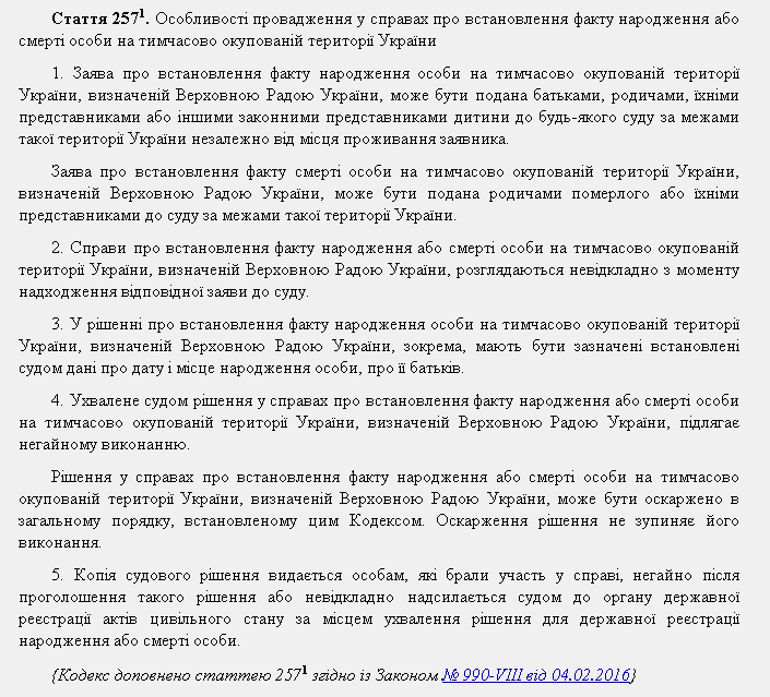 Свои решения суды обосновывают статьей 257-1 Гражданского процессуального кодекса Украины. Эта статья устанавливает особенности судопроизводства в делах об установлении факта рождения или смерти на "временно оккупированной территории":