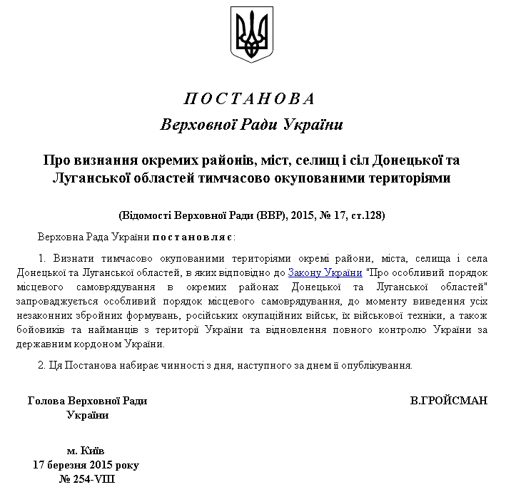 С другой стороны, в постановлении Верховной Рады от 17 марта 2015 №254 те районы и населенные пункты Донецкой и Луганской областей, где введен особый порядок самоуправления, были названы также "временно оккупированными". Согласно постановлению, они будут считаться оккупированными до момента: