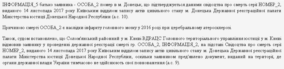 И таких решений множество. Практически всегда суды идут навстречу заявителям, и признают факты рождения и смерти на неподконтрольных территориях. При этом суды почти всегда ссылаются на выданные на этих территориях документы. Ведь других доказательств, как правило, нет. Понятно, что учреждения, которые выдают такие документы, центральной украинской власти не подчиняются и ею не признаются.