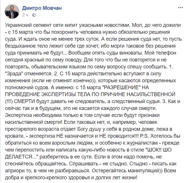 "С 15 марта "разрешение" на проведение экспертизы тела по причине насильственной смерти будет давать не следователь, а следственный судья. Как и сейчас, так и в будущем это не касается каждого случая смерти. Экспертиза необходима только в том случае, если будут признаки насильственной смерти! Если таковых нет, и, например, человек престарелого возраста отдает Богу душу у себя в родном доме, лежа в кровати, – экспертиза не назначается и не проводится", – пишет на этот счет в Facebook судья Ленинского райсуда Днепра Дмитрий Мовчан.