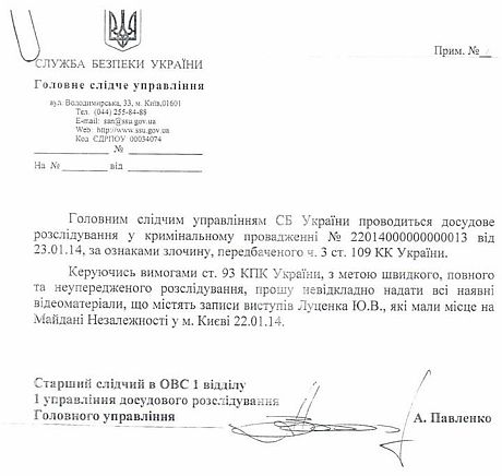 Но вскоре после его выступления на "Эхе Москвы" с подачи Мустафы Найема (на тот момент - журналиста, а сегодня - нардепа от БПП) в начале февраля 2014 года было обнародовано "письмо СБУ", из которого следовало - Служба безопасности затребовала "немедленно предоставить все имеющиеся видеозаписи выступлений Юрия Луценко, которые имели место на Майдане Незалежности 22 января 2014 года".