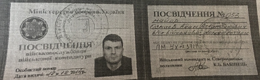 При этом "удостоверение" на право ношения данного пистолета УХ 3717, выданное военнослужащему комендатуры Северодонецка, майору Адаму Осмаеву, также обнаруженное на Подоле, аналогично является липой.