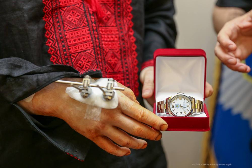 Следы ранения на кисти правой руки Осмаева во время вручения ему подарочных часов от министра внутренних дел Арсена Авакова, источник фото: facebook.com/arsen.avakov.1