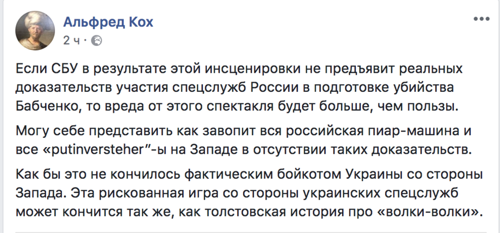 "Если СБУ в результате этой инсценировки не предъявит реальных доказательств участия спецслужб России в подготовке убийства Бабченко, то вреда от этого спектакля будет больше, чем пользы, – пишет у себя на ФБ известный российский оппозиционер Альфред Кох. – Могу себе представить, как завопит вся российская пиар-машина и все "putinversteher"-ы на Западе в отсутствие таких доказательств. Как бы это не кончилось фактическим бойкотом Украины со стороны Запада. Эта рискованная игра со стороны украинских спецслужб может кончиться так же, как толстовская история про "волки-волки". Если фотография из паспортного стола – единственное доказательство причастности российских спецслужб, то это очень идиотский аргумент: интернет наводнен фотографиями Бабченко, которые, разумеется, намного аутентичнее черно-белого снимка анфас с напряженной рожей (как все мы снимаемся на паспорт)".