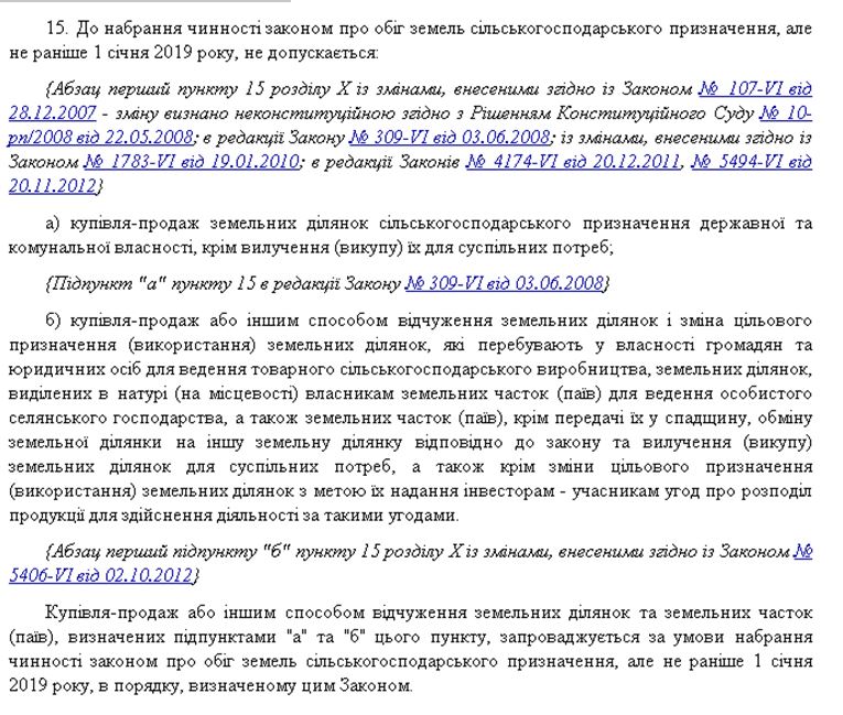 Весь сыр-бор разгорелся из-за нормы п.15 Переходных положений Земельного кодекса, которая запрещает куплю-продажу и другие виды отчуждения участков сельскохозяйственного назначения, предназначенных для товарного производства и ведения личного крестьянского хозяйства: