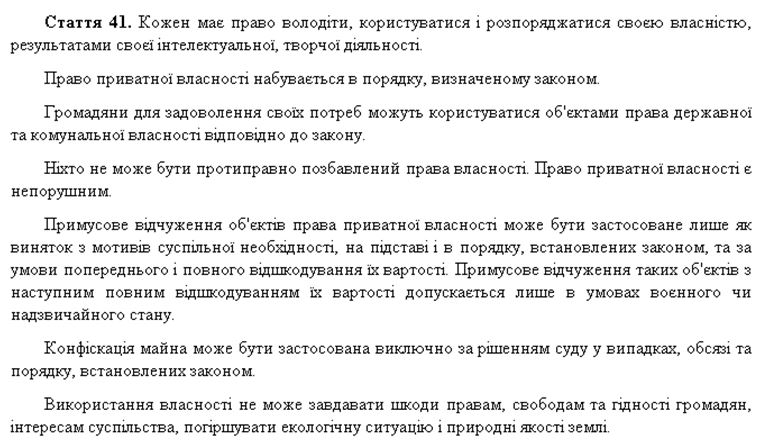 В качестве своего главного аргумента София Зеленчук и Виктор Цыцюра ссылались на статью 41 Конституции, согласно которой каждый может владеть, использовать и распоряжаться своей собственностью. Также никто не может быть незаконно лишен права собственности, а право на частную собственность неприкосновенно: