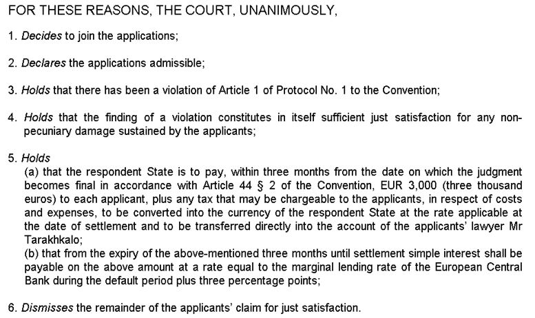 Все, что решил суд, – он единогласно признал, что в случаях заявителей имело место нарушение статьи 1 Протокола №1 к Конвенции. Остальные требования суд отклонил:
