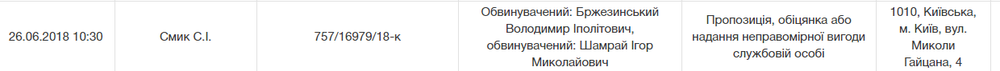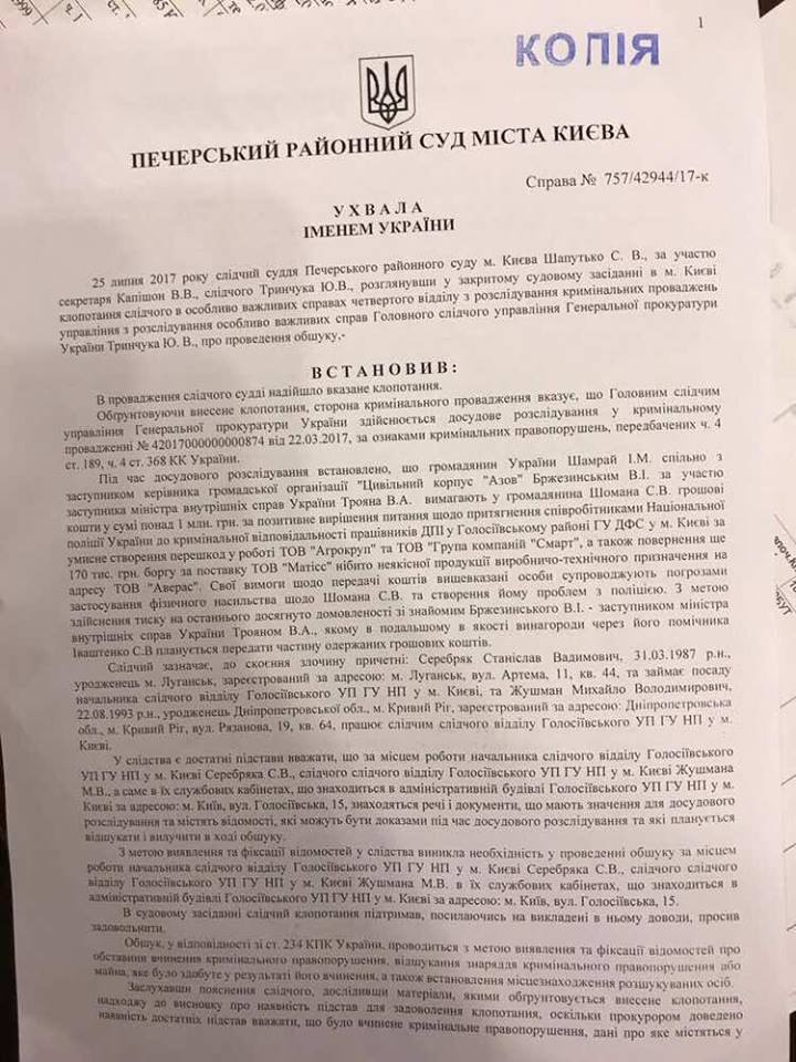 Во-первых, Шамрай и Бржезинский при участии замминистра внутренних дел якобы потребовали более 1 млн грн у Шомана за привлечение к ответственности "кошмарящих" его сотрудников налоговой инспекции Голосеевского района Киева. В судебной "ухвале" говорилось, что препятствия в работе фискалы создавали двум компаниям - ООО "Агрокруп" и ООО "Группа компаний "Смарт" (в начале июля 2016 года ее руководителем две недели являлся Сергей Шоман).
