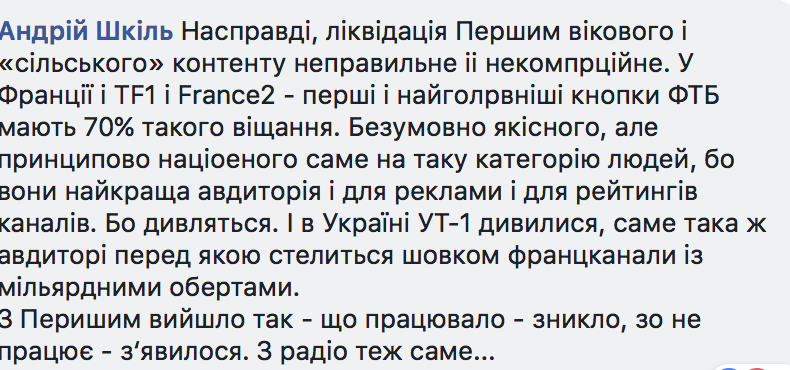 "Ранее УТ-1 и Укррадио можно было по-любому поймать даже на глубокой периферии. Старшее поколение его обязательно смотрело и слушало. Когда же футбол, олимпиада или музыкальное событие в прямом эфире, то все переключали на Первый... И он был в первой десятке. А теперь там глухо”, - пишет журналист Мыкола Пидвезяный в посте на своей странице в Фейсбуке.