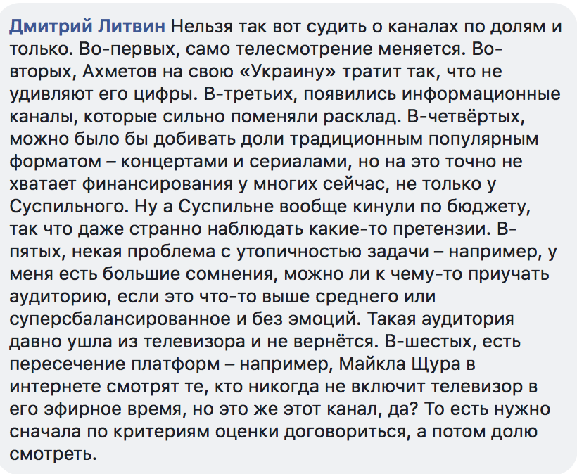 С этим согласен и медиаэксперт Михаил Подоляк. "Это звучит крайне странно. Как может "качественный контент" не приносить рейтинги? Тогда для кого он качественный, если никто его не смотрит? Стандартное нарушение логики".