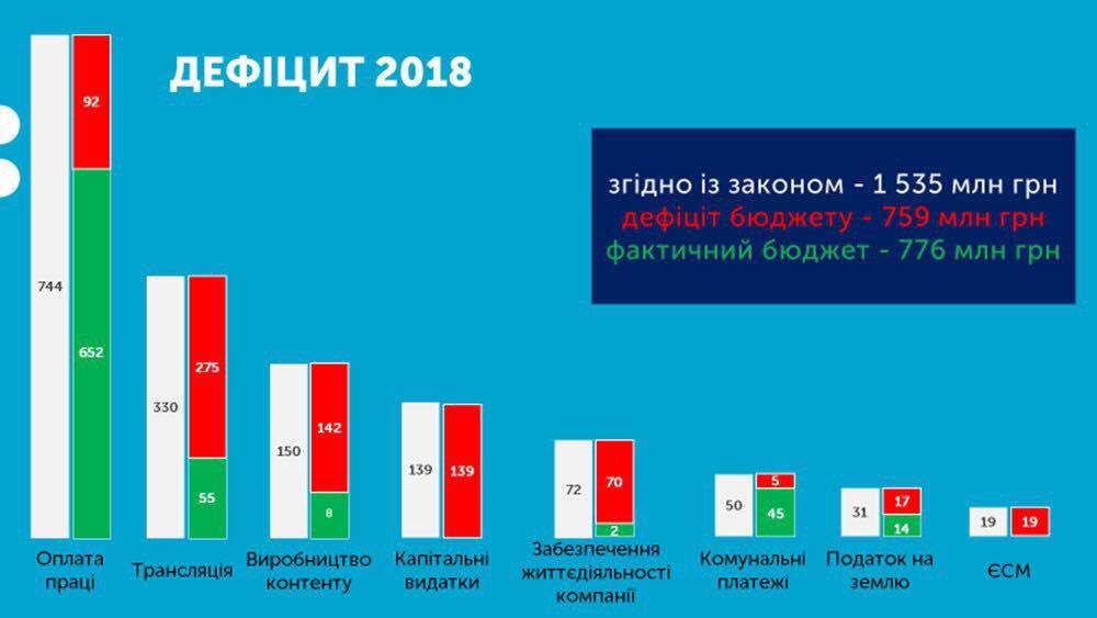 "Ежегодные членские взносы Европейского вещательного союза составляют около 19 млн гривен. Еще 744 млн грн в год необходимо для оплаты труда сотрудников. Производство контента и обеспечение жизнедеятельности компании требуют расходов в сумме 150 млн грн и 72 млн грн соответственно. Таким образом дефицит бюджета Общественного в 2018 году составляет 759 млн грн", - уточняют в пресс-службе “UA:Першого”.