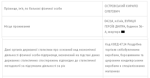 По данным Единого реестра юридических лиц, Кирилл Островский зарегистрирован в качестве предпринимателя по официальному месту жительства – в доме на ул. Героев Днепра в Киеве: