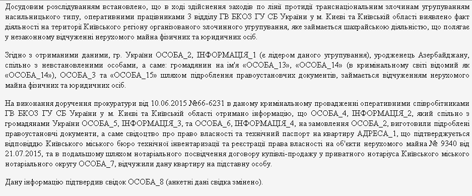 По эпизоду, о котором идет речь, главарь ОПГ (который родом из Азербайджана) заказал изготовление поддельных документов на квартиру – свидетельства о праве собственности и технического паспорта. Потом, через договор купли-продажи у нотариуса, чужую квартиру продали на подставное лицо: