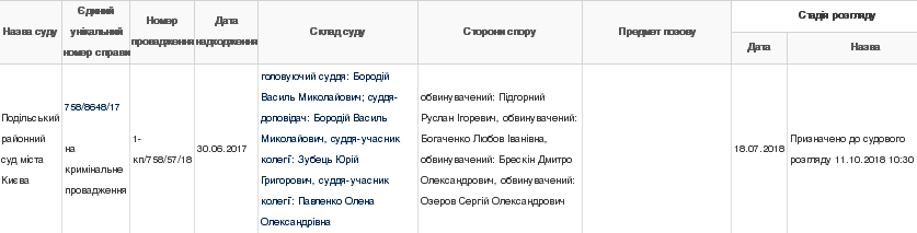 Однако в марте 2016 года по материалам СБУ уголовное производство было открыто по-новой, под №42016101100000073, и с той же фабулой. Следствие по делу уже закончено, и оно передано в Подольский райсуд Киева. Обвиняются по нему, согласно данным портала "Судебная власть", совершенно другие люди: