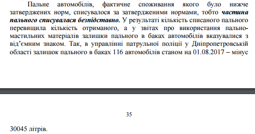А иногда остатки горючего в баках вообще указывались в отчетах с отрицательным знаком. Например, в управлении патрульной полиции Днепропетровской области остаток топлива в баках 116 автомобилей на 1 августа 2017 года составил "минус" 30 045 литров: