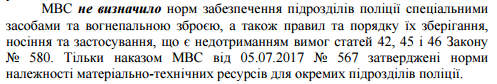 У Нацполиции также нет утвержденного порядка применения спецсредств и оружия. В МВД не определили нормы обеспечения ними, а также правила их хранения и ношения. Хотя это прямо предусмотрено законом "О Нацполиции":