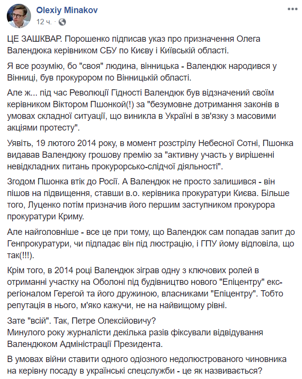 Сам он утверждал, что не имеет никакого отношения к разборкам вокруг SkyMall. Версию о помощи Валендюку в его люстрационной эпопее один из ближайших соратников президента Петра Порошенко также называл не соответствующей действительности.