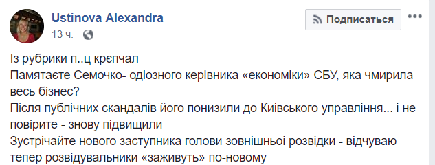 Впрочем, утверждать о том, что Сергей Семочко попал в опалу и окончательно лишился протекции со стороны власти будет преждевременно. Член правления "Центра противодействия коррупции" Александра Устинова рассматривает новое место приложения сил эсбуэшника как повышение.