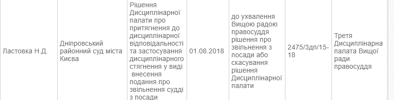 А через две недели, 1 августа, Третья дисциплинарная палата Высшего совета правосудия огласила свой вердикт в другой скандальной истории Ластовки. Судья была привлечена к дисциплинарной ответственности, а в качестве взыскания было внесено представление об увольнении ее с должности.