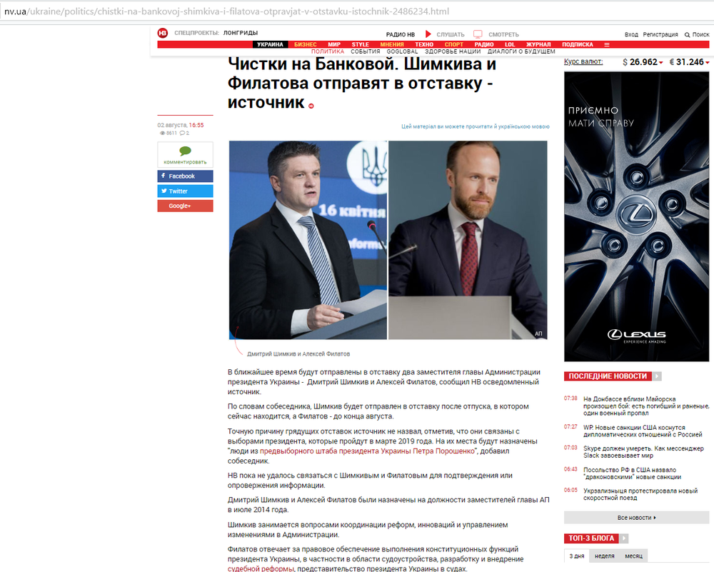 Во-вторых, на прошлой неделе (буквально через пять дней после обнародования "проекта" решения Конституционного суда по судебной реформе) на сайте "Новое время" вышел материал, где со ссылкой на источник прогнозируется скорая (до конца августа) отставка Алексея Филатова.