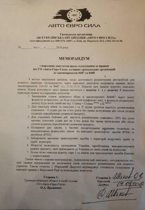Чтобы придать мероприятию зрелищности, активисты даже устроили флешмоб, разместив фото депутатов, которые накануне подписали меморандум с "АвтоЕвроСилой" и тех, кто этого не сделал. Сам меморандум был подписан с рядом депутатов (Иван Мельничук, Владимир Парасюк, Юрий Деревянко, Виталий Куприй и другие) накануне, и в нем зафиксирована готовность сторон сообща работать над законопроектами №8487 и 8488.