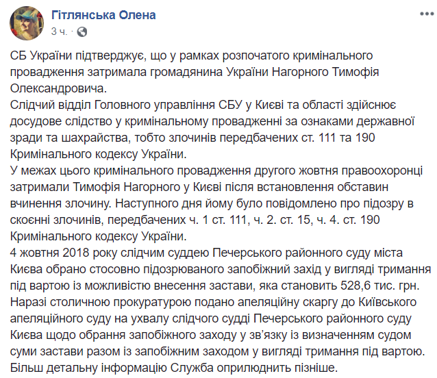 С их подачи сначала стала общеизвестной причина отсутствия Тимофея на связи. Приятели бизнесмена указали - он находится в киевском СИЗО. А в сети было обнародовано решение суда, согласно которому Нагорный был помещен под арест.