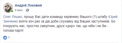 На эти противоречия накладывается недовольство заместителя Ляшко в политсиле и фракции Андрея Лозового, который, по словам источников, считает, что в силу официальных должностей и истории отношений с лидером он должен иметь больше влияния на принятие решений в РП. Лозовой якобы интригует как против политконсультантов, так и Зинченко, выплескивая раздражение даже в Фейсбук.