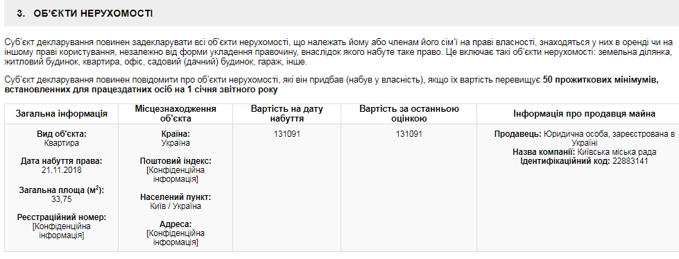 В конце прошлого года Владимир Говоруха сообщил о существенных изменениях в составе своего имущества. В документе, поданном в Национальное агентство по предотвращению коррупции, будущий глава ВСП сообщил, что 21 ноября прошлого года купил в Киеве квартиру площадью 33,7 кв. м. всего за 131 тыс. грн. Причем продавцом квартиры указан Киевский городской совет: