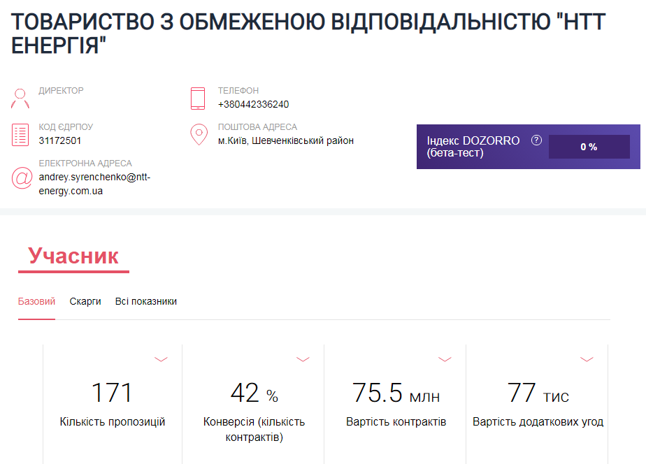 По данным системы "Дозорро", ООО "НТТ Энергия" заключило контрактов на 75 миллионов гривен. Основными клиентами были Украэрорух, Укргаздобыча, Укрэнерго и Ощадбанк. В большинстве случаев речь идет о поставках, ремонте и техобслуживании дизель-генераторов и систем автономного энергоснабжения. Кроме того, адрес электронной почты Андрея Сиренченко указан как контакт лица "НТТ Энергия", уполномоченного для подачи документов на тендеры: