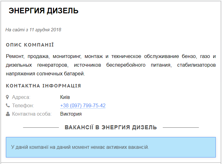 В качестве контактного лица указана "Виктория", телефон соответствует регистрационным данным фирмы. А в качестве видов деятельности указаны "ремонт, продажа, мониторинг, монтаж и техническое обслуживание бензо-, газо- и дизельных генераторов, источников бесперебойного питания, стабилизаторов напряжения солнечных батарей":