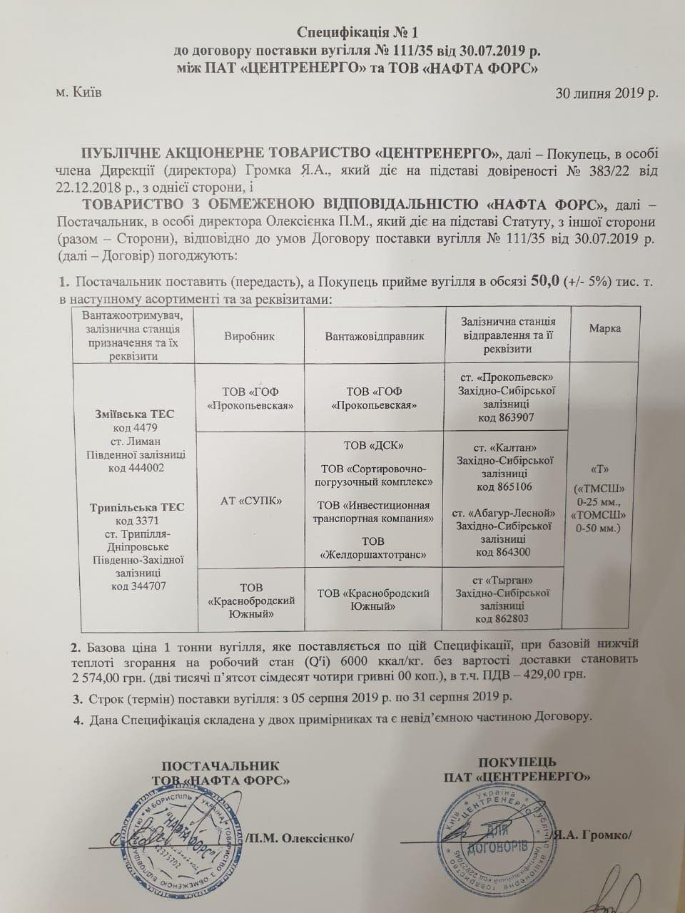 Есть также спецификация на 50 тысяч тонн угля от этого же поставщика по 2574 гривни за тонну.
