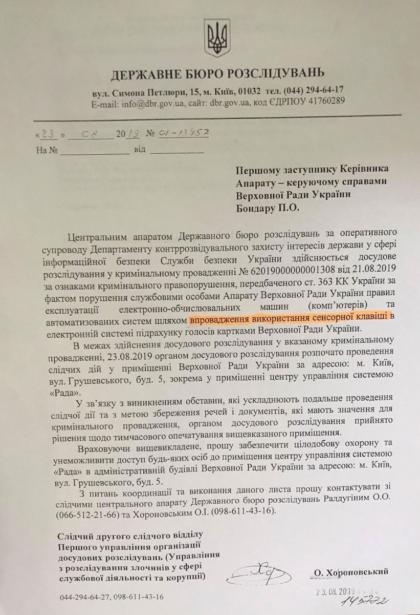 Часть фабулы уголовного дела изложена в письме "украинского ФБР" на имя главы аппарата парламента Петра Бондаря, источник фото: sud.ua