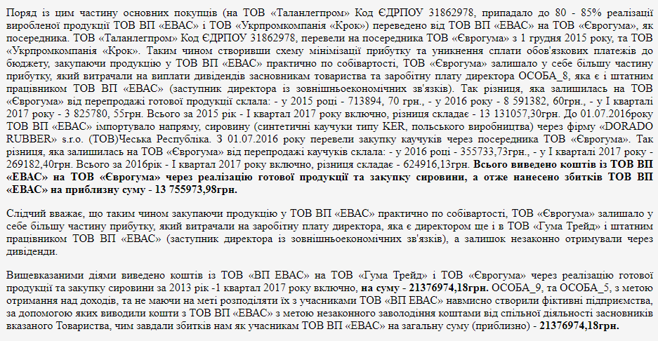 Например, в определении Соломенского суда Киева по данному делу, говорится, что "Эвас" было создано для минимизации прибыли и уклонения от уплаты платежей в бюджет. Через посредника покупалось сырье (каучук) и реализовалась готовая продукция: