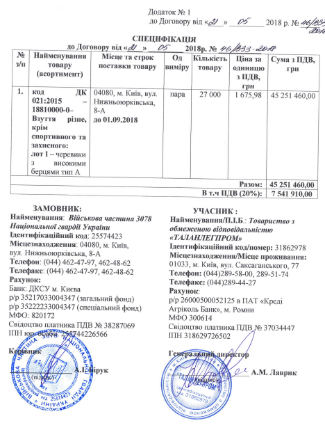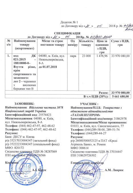 Яркий пример деятельности "Таланлегпрома" – тендер на сумму 79,2 млн грн, где воинская часть Нацгвардии закупила 50 тыс пар утепленных ботинок с высокими берцами. Без какого-либо конкурса, по процедуре закупки у одного участника, были заключены два договора по этой закупке.