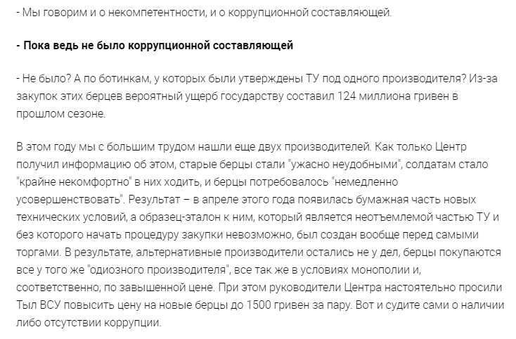 Вывод о том, что технические условия (ТУ) по ботинкам были утверждены Минобороны под одного производителя, в 2016 году подтвердил глава комитета по конкурсным торгам Минобороны Олег Свирко. В результате, по его словам, был нанесен ущерб в сотни миллионов: