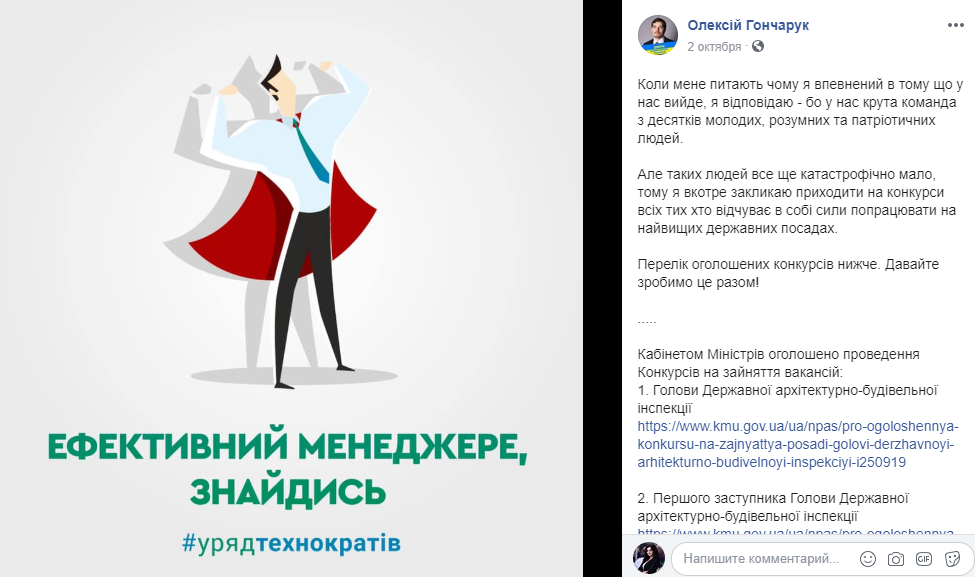 Сам премьер-министр Алексей Гончарук на своей странице в Фейсбуке пиарил те же вакансии (правда, со ссылками не на рекрутинговое онлайн-агентство, а на сайт Кабмина).