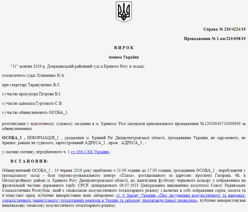 Вся фабула преступления поместилась в один абзац приговора. Местный житель Олег А. (фамилия есть в редакции "Страны") в футболке с гербом СССР находился возле торгово-развлекательного центра "Плаза" по проспекту Гагарина, 4Б в Кривом Роге 14 июня, с 11 до 17 часов: