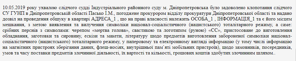 Расследование началось с того, в следственный отдел полиции поступил рапорт сотрудников управления СБУ. В рапорте говорилось, что на территории Днепропетровской области действует организованная группа, которая в течение длительного времени осуществляет изготовление и распространение нацистской символики.