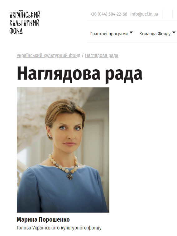 Жена Петра Порошенко Марина возглавляет наблюдательный совет УКФ, а также является главой фонда. Об этом сообщается на сайте фонда: