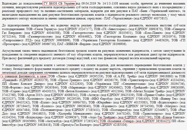 В дальнейшем, данные денежные средства перечисляются на счета подконтрольных субъектов предпринимательской деятельности с признаками фиктивности, в число которых отнесено и спонсор партии Порошенко "Компания "Гепард".