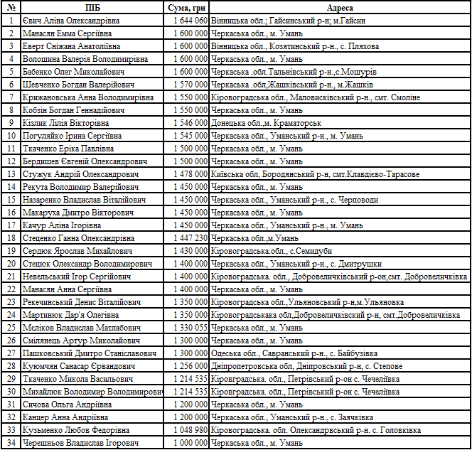 Наибольшие взносы в сумме 35 млн заплатили всего 22 человека, по 1,6 млн каждый. Остальные суммы не превышали 150 тысяч гривен.