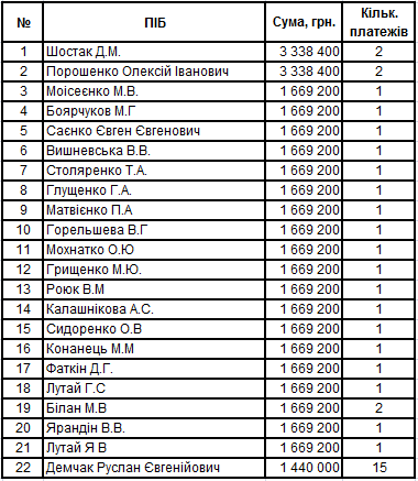 21 человек внес в партийную казну совершенно одинаковые суммы – 1 669 200 грн. Причем двое это сделали по два раза, в том числе и отец экс-президента Алексей Порошенко. А экс-депутат от "Блока Петра Порошенко" Руслан Демчак растянул удовольствие помощи родной партии на 15 платежей на общую сумму 1,5 миллиона: