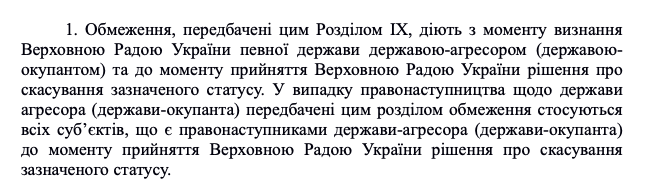 Но ограничения будут связаны не только с самим "государством-агрессором", но и в случае появления его "правопреемников". Очевидно, авторы закона считают, что за время действия закона Россия в нынешнем виде прекратит существование, а вместо нее появится какая-то другая страна - при чем тоже агрессор.
