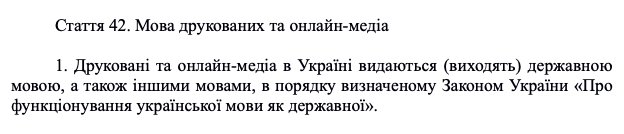 Напомним, с 16 мая 2022 года должны будут полностью украинизироваться интернет-СМИ, зарегистрированные в Украине. Страничка на украинском языке должна будет загружаться автоматически, а функцию чтения материалов на русском языке сделать дополнительной, по желанию. Странички СМИ в социальных медиа, например, в Facebook или Инстаграм, также переведут на украинский язык. Тоже самое касается мобильных приложений медиа. Эта норма не касается крымско-татарских СМИ, англоязычных и СМИ, которые выходят на официальных языках Евросоюза.